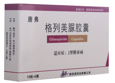 格列美脲胶囊 2毫克×30粒 广西百琪药业有限公司 国药准字H20030283 2型糖尿病。 遵医嘱口服用药。对于糖尿病患者,格列美脲或任何其它降糖药物都无固定剂量,必须定期测量空腹血糖和糖化血红蛋白以确定患者用药的最小有效剂量;测定糖化血红蛋白水平以监测患者的治疗效果。通常起始剂量:在初期治疗阶段,格列美脲的起始剂量为1~2mg每天一次,早餐时或第一次主餐时给药。那些对降糖药敏感的患者应以1mg每天一次开始,且应谨慎调整剂量。格列美脲与其它口服降糖药之间不存在精确的剂量关系。格列美脲最大初始剂量不超过2mg。通常维持剂量:通常维持剂量是1~4mg每天一次,推荐的最大维持量是6mg每天一次。剂量达 1.低血糖,本品可引起低血糖症,尤其老年体弱患者在治疗初期,不规则进食,饮酒及肝肾功能损害患者,据报道,发生率为2%。2.消化系统症状:恶心呕吐,腹泻、腹痛少见。3.有个别病例报道血清肝脏转氨酶升高。4.皮肤过敏反应,瘙痒、红斑、荨麻疹少见。5.其他:头痛、乏力、头晕少见。 1.病人用药时应遵医嘱,注意饮食,运动和用药时间。2.治疗中应注意早期出现的低血糖症状,如头痛、兴奋、失眠、震颤和大量出汗,以便及时采取措施,严重者应静脉滴注葡萄糖液,对有创伤、术后,感染或发热病人应给与胰岛素维持正常血糖代谢。3.避免饮酒,以免引起类戒断反应。 1.已知对格列美脲有过敏史者禁用。2.糖尿病酮症酸中毒伴或不伴昏迷者禁用,这种情况应用胰岛素治疗3.孕妇、分娩妇女、哺乳期妇女禁用。 本品为第二代磺酰脲类口服降血糖药,其降血糖作用的主要机理是刺激胰岛β细胞分泌胰岛素,部分提高周围组织对胰岛素的敏感性。本品与胰岛素受体结合及离解的速度较格列本脲为快,较少引起较重低血糖。